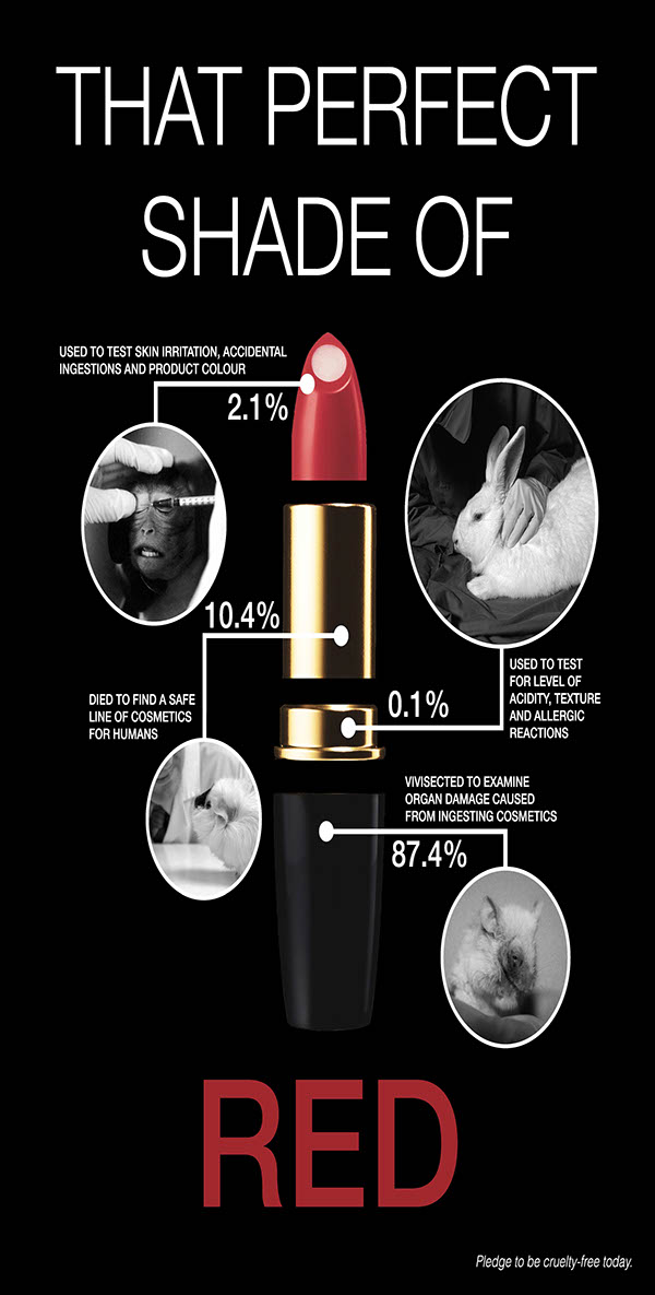 Some of the common cosmetic testing are skin and eye irritation tests. In these types of testing, chemicals are rubbed onto the shaved skin of the animal or dripped into their eyes for a period of days then killed. They also do repeated oral-force feeding studies that look out for signs of illness or specific health hazards such as cancer or birth defects. There are many more forms of testings that animals undergo, but all of these tests can cause tremendous pain and distress including blindness, sore bleeding skin, internal bleeding, and even death. The most disturbing thing is some companies will not provide pain relievers for the animals after they have been undergoing the extreme testings.